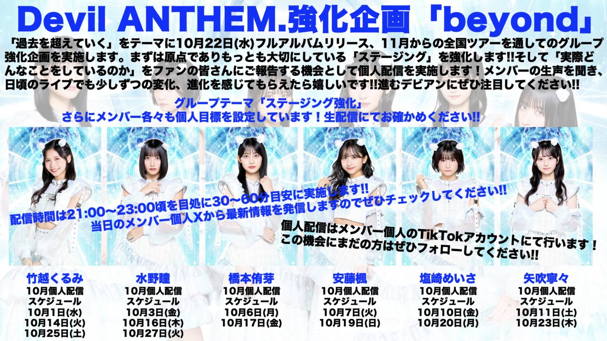 「過去を超えていく」をテーマに10月22日(水)フルアルバムリリース、11月からの全国ツアーを通してのグループ強化企画を実施します。まずは原点でありもっとも大切にしている「ステージング」を強化します。そして「実際どんなことをしているのか」をファンの皆さんにご報告する機会として個人配信を実施します。メンバーの生声を聞き、日頃のライブでも少しずつの変化、進化を感じてもらえたら嬉しいです。進むデビアンにぜひ注目してください。